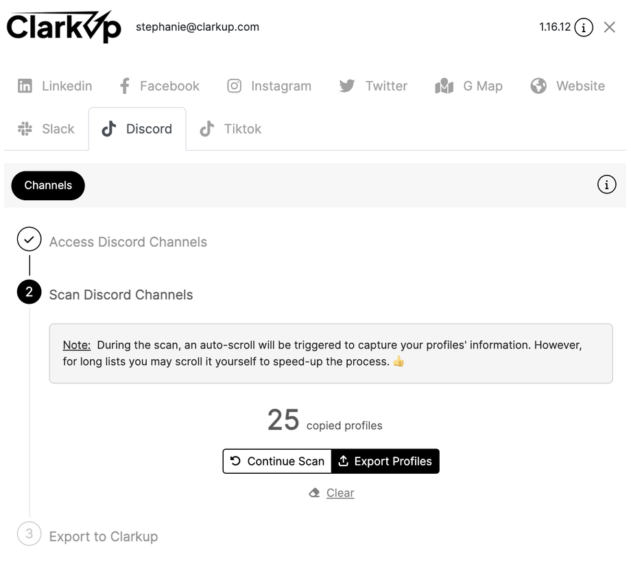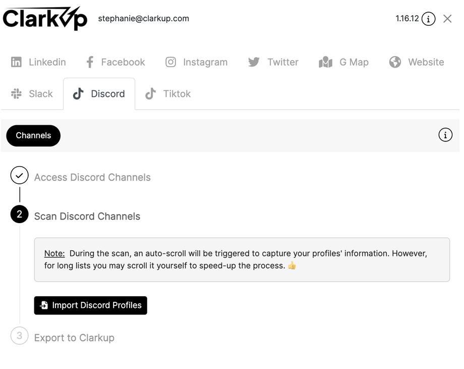 - Ouvrez l'extension Chrome ClarkUp - L'extension s'ouvrira automatiquement sur l'onglet dédié Discord - Channels