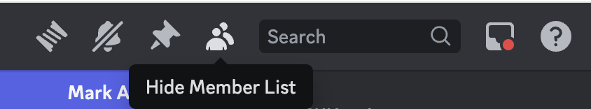 - Cliquez sur l'icône représentant les membres "Hide Member List". La liste des membres va apparaître sur la partie droite du channel. Veillez à la laisser ouverte.
