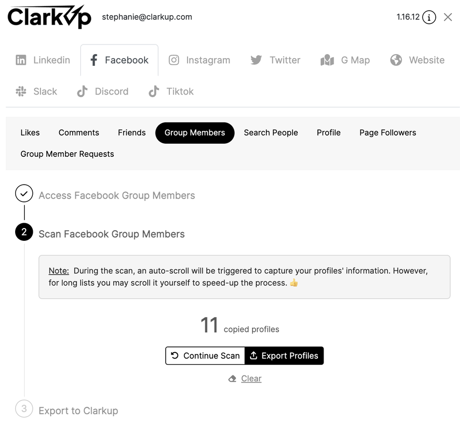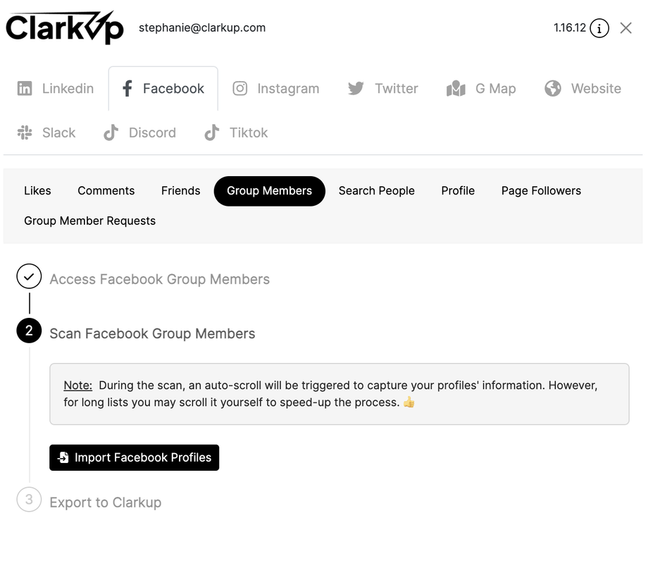 - Ouvrez l'extension Chrome ClarkUp - L'extension s'ouvrira automatiquement sur l'onglet dédié aux membres des groupes Facebook.