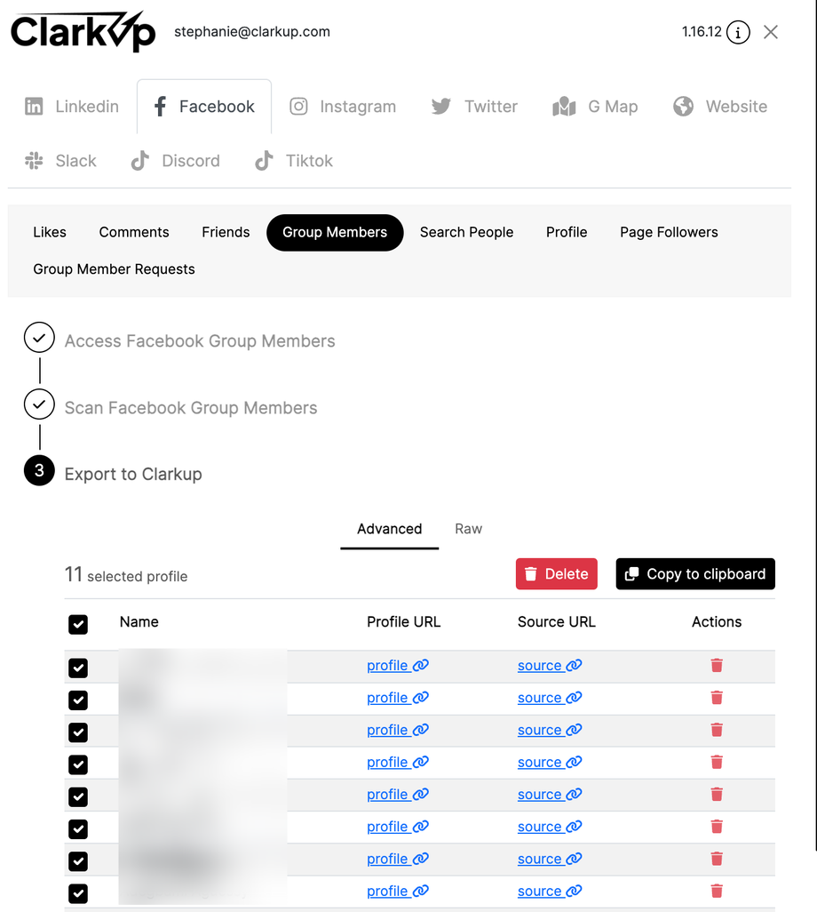 Vous venez d'intégrer, en quelques clics, sur votre espace membre ClarkUp des leads scrapés depuis les membres d'un groupe Facebook.