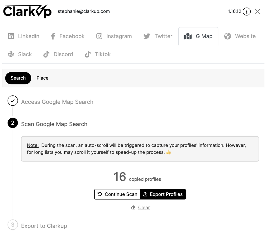 - Ouvrez l'extension ClarkUp - L'extension s'ouvrira automatiquement sur l'onglet dédié à Google Maps.