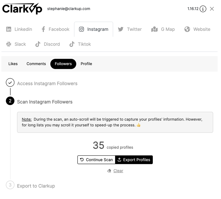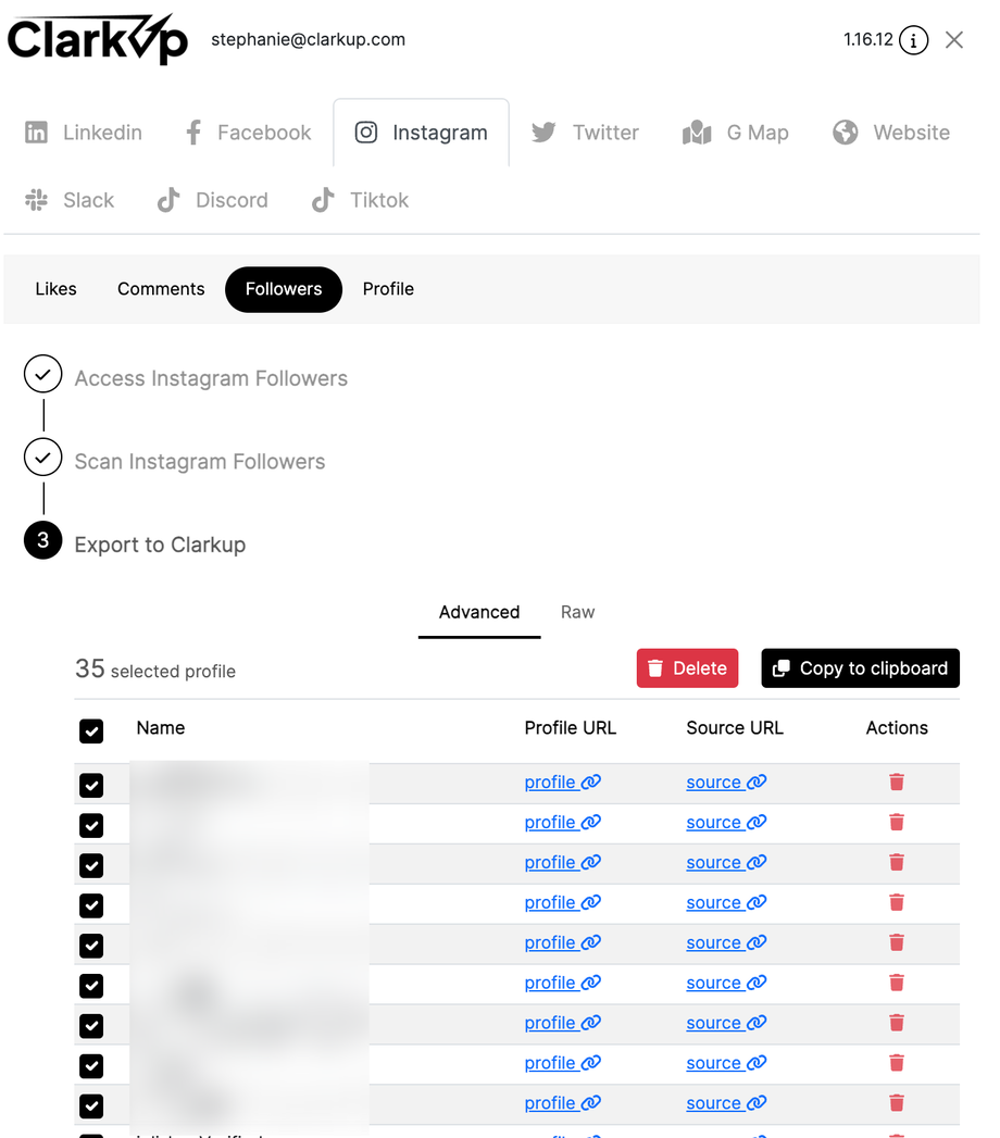 Vous venez d'intégrer, en quelques clics, sur votre espace membre ClarkUp des leads scrapés via vos Followers Instagram ou ceux d'autres profils.