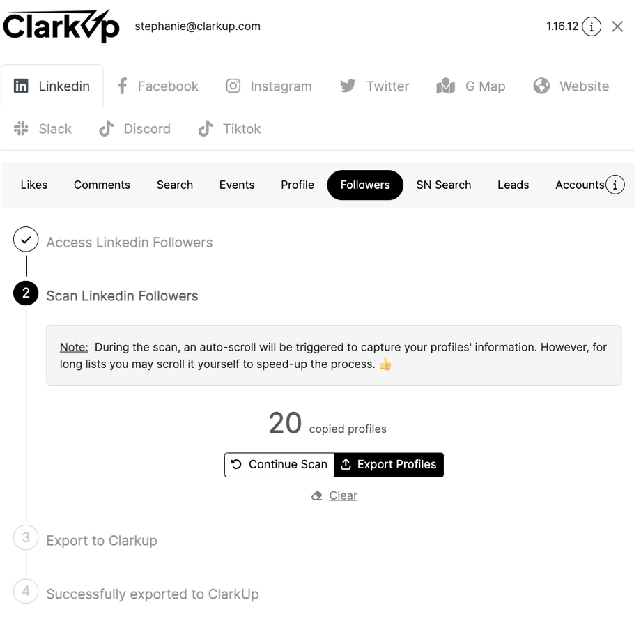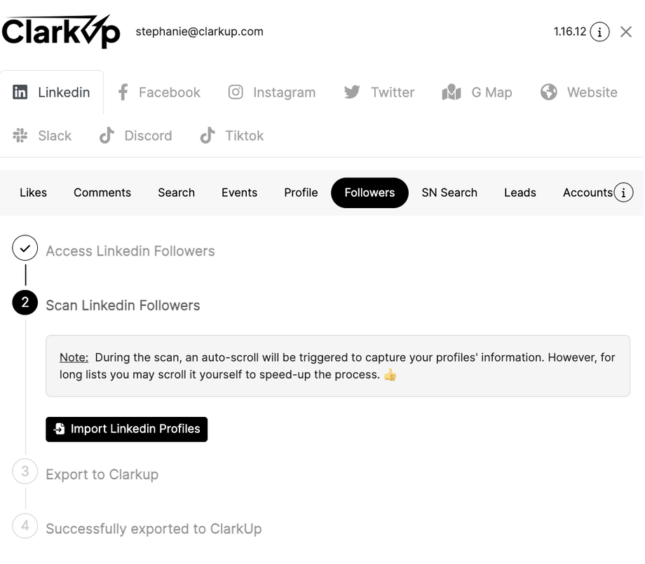 - Ouvrez l'extension Chrome ClarkUp- L'extension s'ouvrira automatiquement sur l'onglet dédié LinkedIn-Followers.