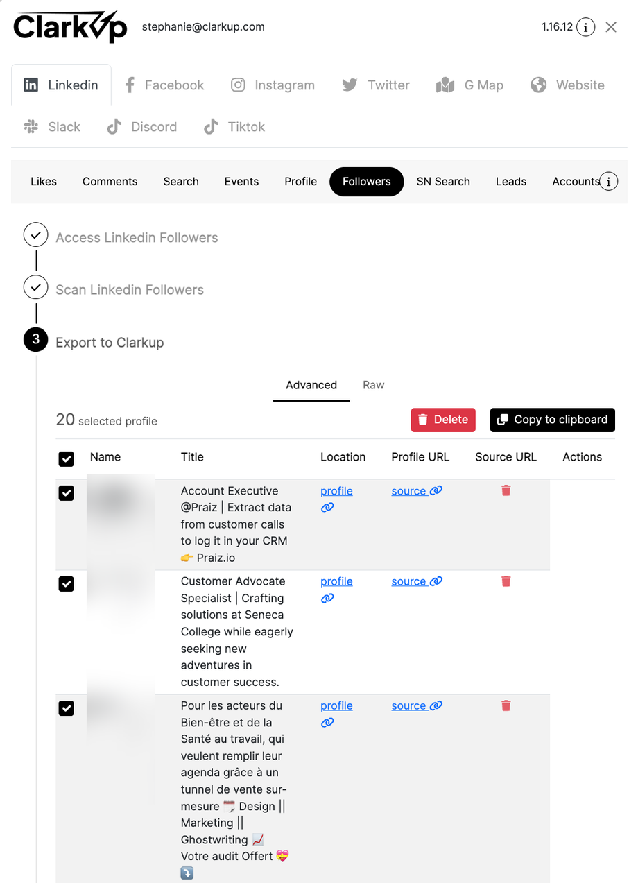 Vous venez d'intégrer, en quelques clics, sur votre espace membre ClarkUp des leads scrapés via vos followers LinkedIn.