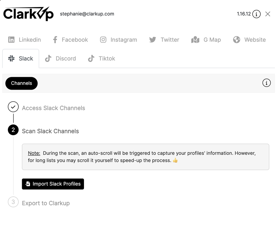 - Ouvrez l'extension Chrome ClarkUp - L'extension s'ouvrira automatiquement sur l'onglet dédié aux membres Slack-Channels.