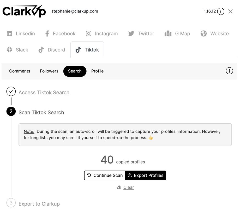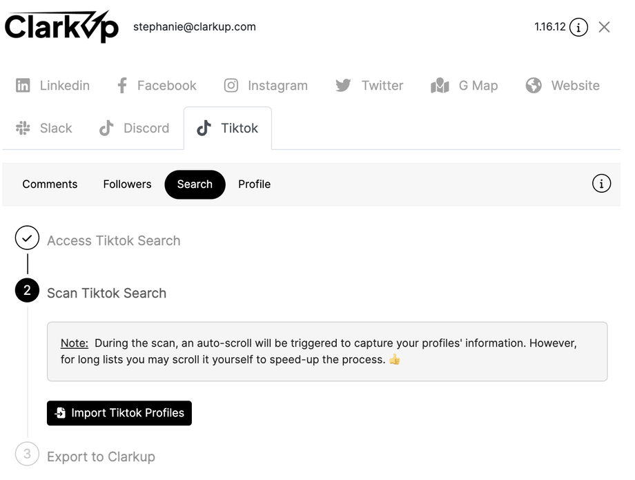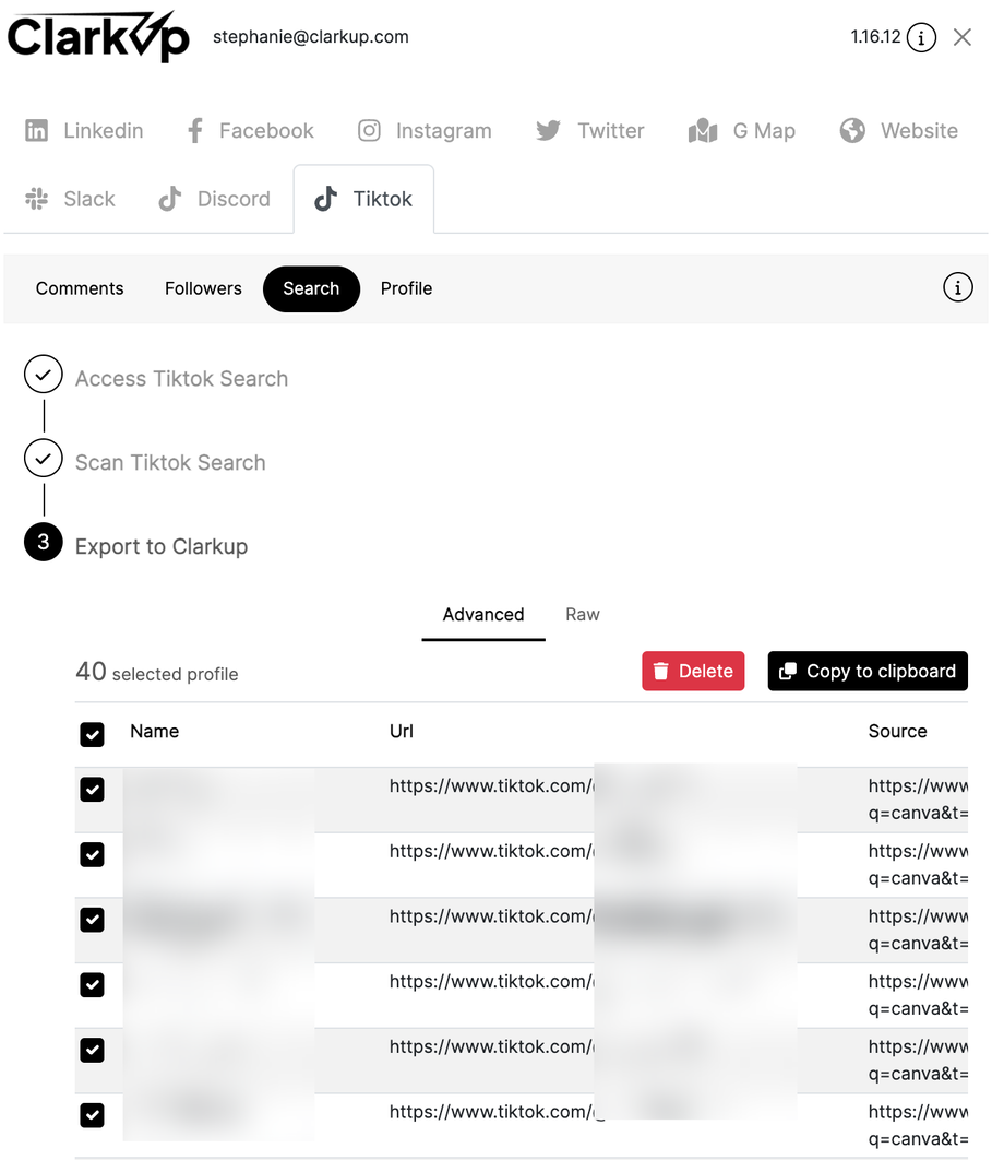 Vous venez d'intégrer, en quelques clics, sur votre espace membre ClarkUp des leads scrapés depuis une recherche avancée sur TikTok.