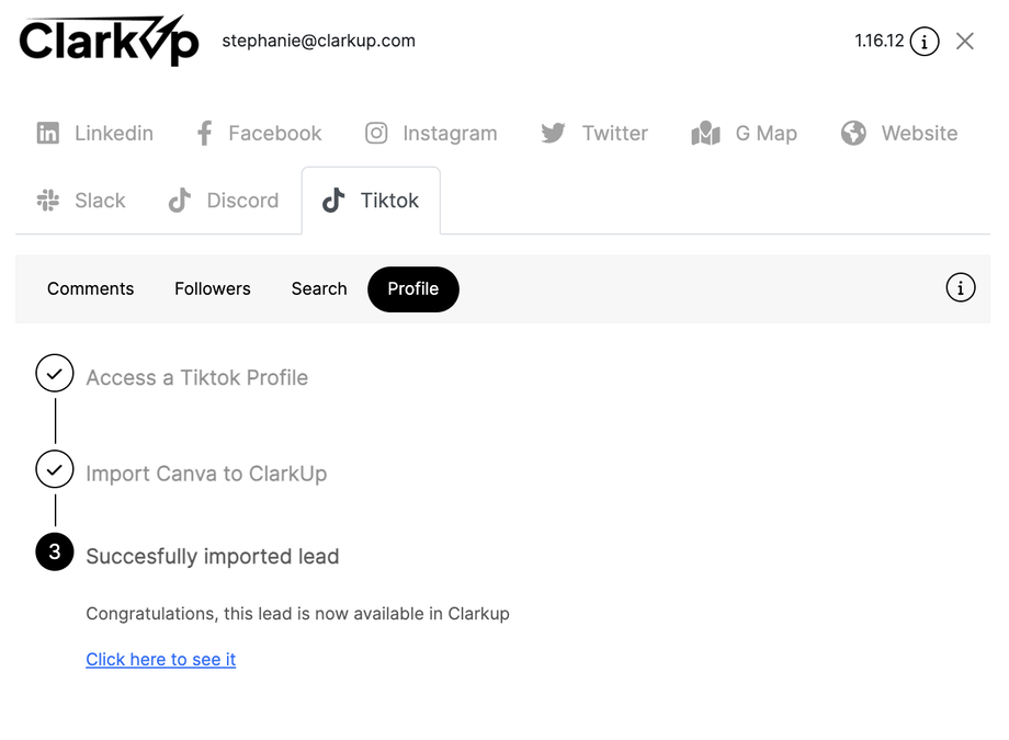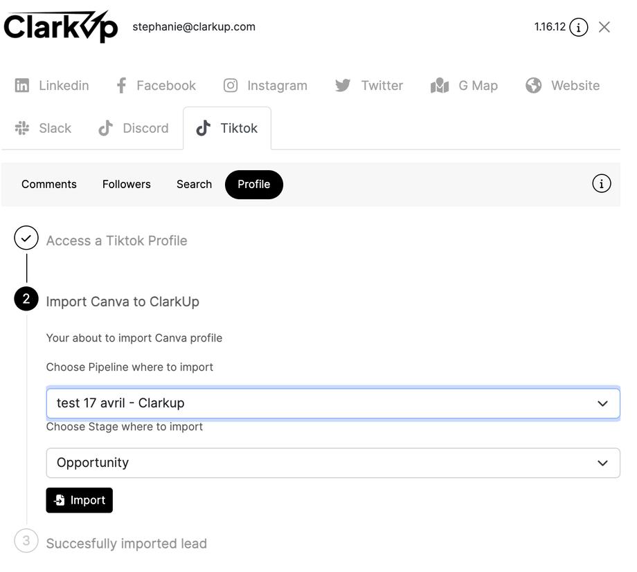 Vous venez d'intégrer, en quelques clics, sur votre espace membre ClarkUp un leads scrapé depuis son profil TikTok.