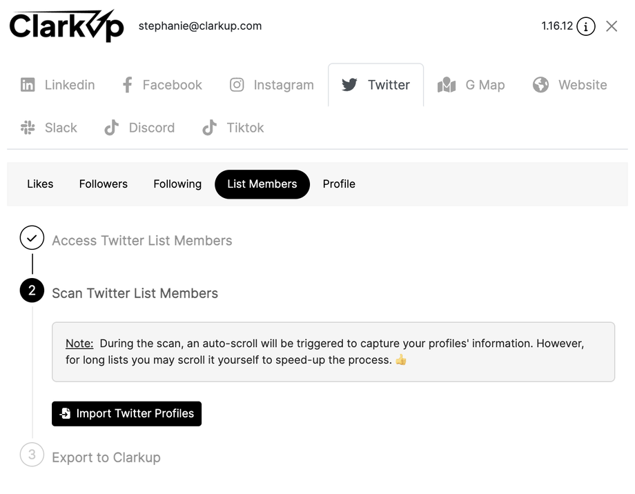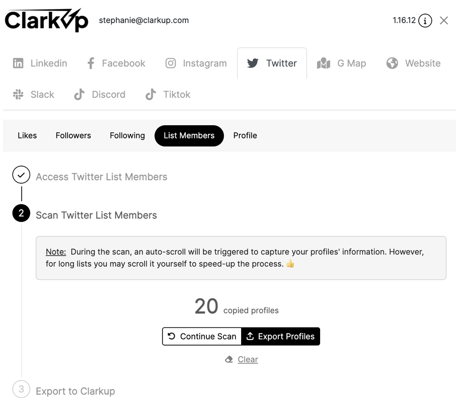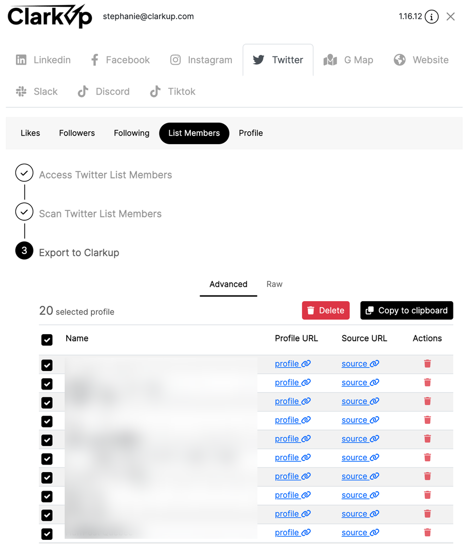 Vous venez d'intégrer, en quelques clics, sur votre espace membre ClarkUp des leads scrapés depuis les membres d'une liste Twitter(X).