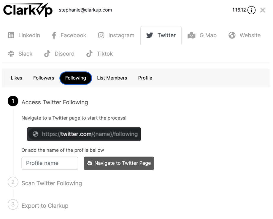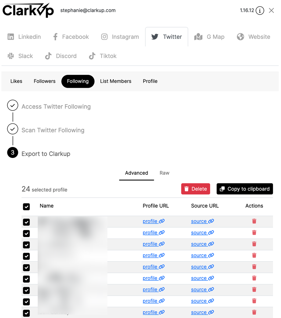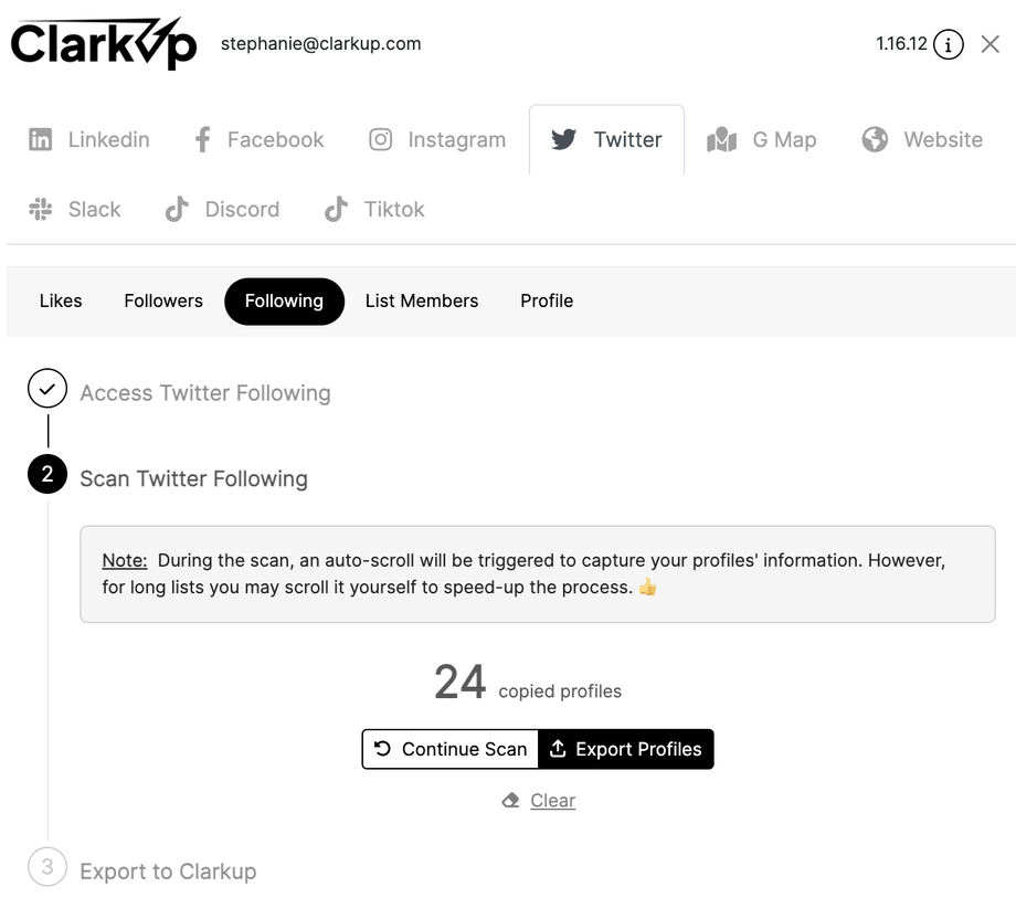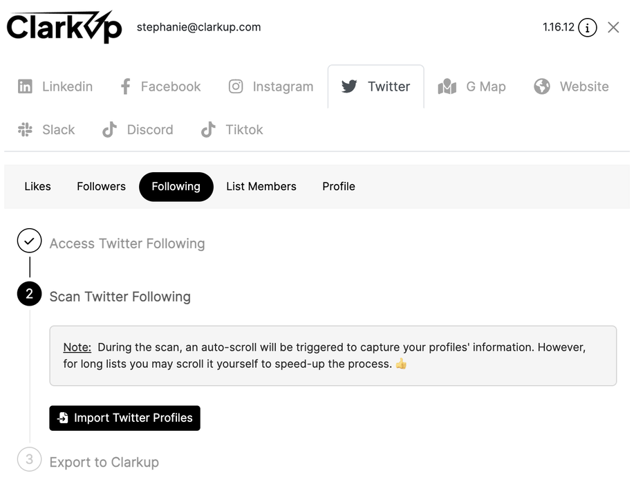 Vous venez d'intégrer, en quelques clics, sur votre espace membre ClarkUp des leads scrapés depuis des Following de Twitter(X)